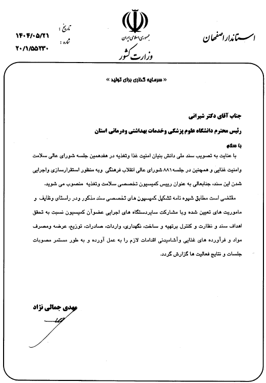 صدور ابلاغ رئیس کمیسیون تخصصی سلامت و تغذیه توسط استاندار دکتر جمالی نژاد استاندار اصفهان در راستای استقرار سازی سند ملی دانش بنیان امنیت غذا و تغذیه، ابلاغ دکتر شیرانی رئیس دانشگاه علوم پزشکی را بعنوان رئیس کمیسیون تخصصی سلامت و تغذیه صادر نمودند.